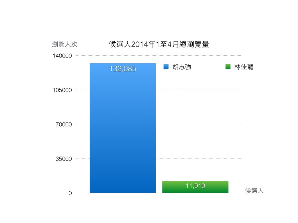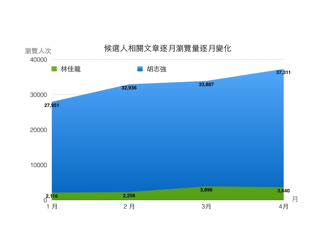 從年初至今的PIXNET兩組候選人相關文章瀏覽量看來,胡志強相關文章的累積瀏覽量約為林佳龍的11倍,但畢竟統計資料為「相關文章」,而非針對候選人個人的討論,凡是提到與台中相關的文章,都有可能有胡志強搭上連結,胡志強已執政13年,累積的相關文章瀏覽量自然多於林佳龍。