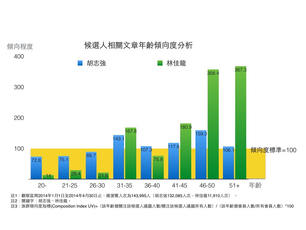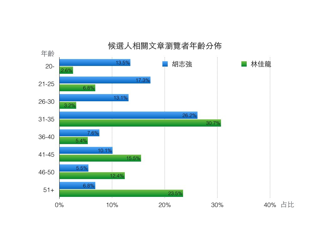 從網路使用者的年齡分佈來看,瀏覽胡志強相關文章的年齡層偏低,以30歲以下偏多;瀏覽林佳龍相關文章的年齡層則相對較高,以30歲以上網路使用者居多。以前述胡志強的關鍵字連結來看,瀏覽內容都是生活資訊類訊息,也是最吸引年輕族群的資訊;而林佳龍的關鍵字連結,瀏覽內容屬於政策性或硬性新聞,較吸引成熟瀏覽者的注意。