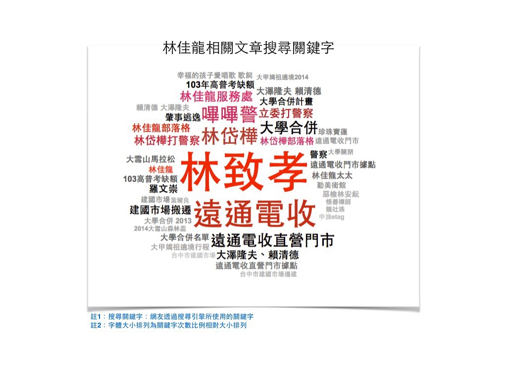 相對胡志強,網友一般搜尋到與林佳龍有關的相關文章,搜尋關鍵字則差異很大,因太陽花學運發生地點在立法院,因此與林佳龍相關的關鍵字,許多都與太陽花學運有關,或曾在立法院出現的質詢議題,這些影響林佳龍網路曝光度的相關關鍵字,多數是林佳龍在立法院所提出的質詢,與林佳龍有政治討論的直接性的關連;從累積瀏覽量及關鍵字看來,網路社群對林佳龍的討論雖沒有廣度,卻有相當高的準度。