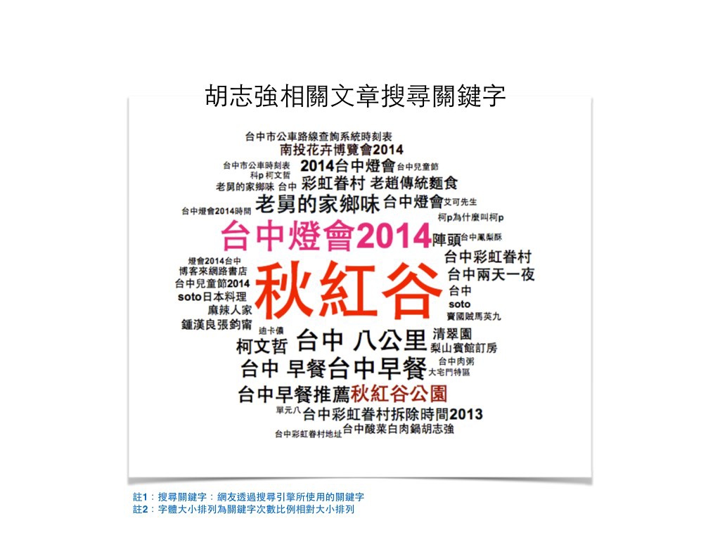 從網友用了什麼樣的搜尋關鍵字看來,與胡志強相關的關鍵字群中,都是台中美食、活動、旅遊、景點等文章,只要與台中地緣相關的都可能與現任首長搭上連結,是胡志強的現任優勢,但是這些關鍵字與胡志強並沒有直接性的關連;從累積瀏覽量及關鍵字看來,網路社群對胡志強的討論只有廣度卻沒有與選舉相關的關聯性,如此可以大膽推論,這是地方首長現任者優勢之一,一般民眾的輿論直接與胡志強相關的地方建設有關,如秋紅谷、台中燈會2014。