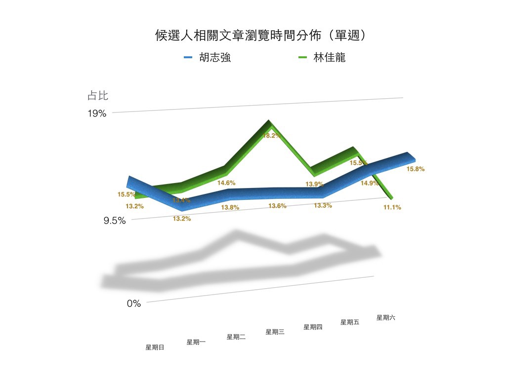 兩組候選人在部落格世界裡,被討論的方式截然不同,也影響了網友閱讀其相關內容的方式,因胡志強的相關的關鍵字與瀏覽文章,都偏生活性的軟性議題,較吸引週末搜尋生活資訊需求的閱聽眾。林佳龍相關討論文章則以政策、公共事務等硬性議題相關,目標群眾為長期關注新聞脈動的人。