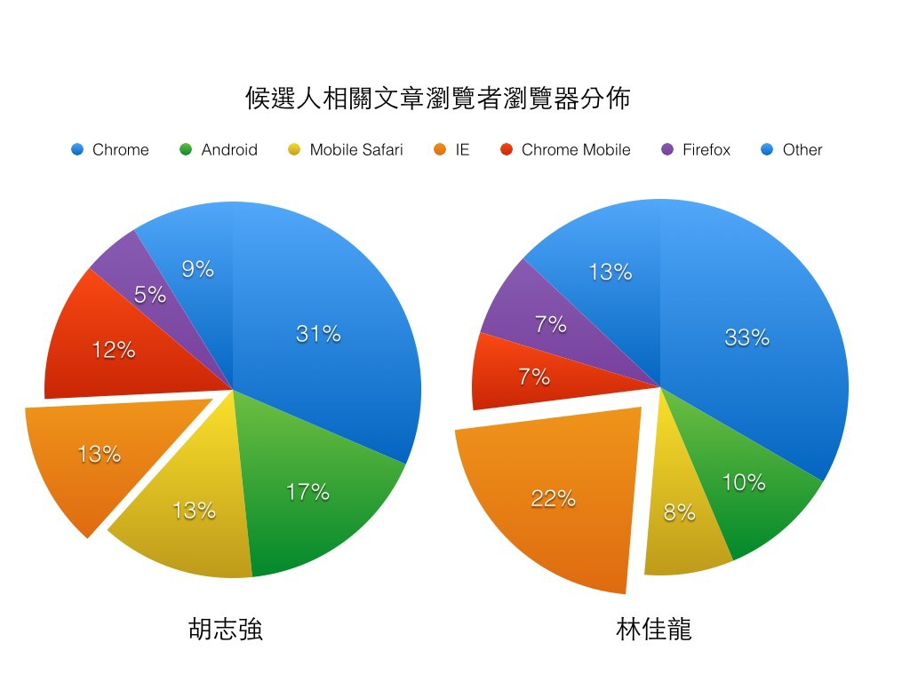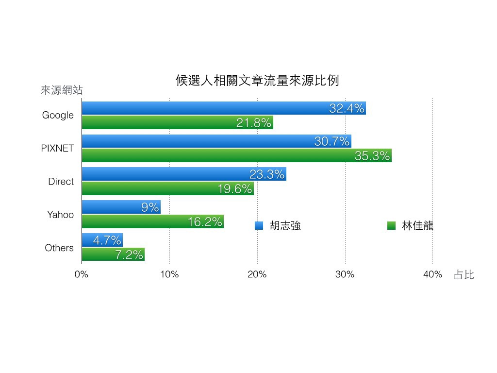 從網路使用習慣也可佐證年齡層與候選人間的關係。因為與胡志強相關的文章偏向生活性資訊,吸引年輕者的關注,而年輕人偏向使用的搜尋系統為Google,並且習慣以手機瀏覽;與林佳龍相關的文章偏向政策性與探討議題的內容,而相對年齡層較高者習慣由YAHOO導入網頁,並以IE作為瀏覽器,而議題探討則以PIXNET的文章較為深入。