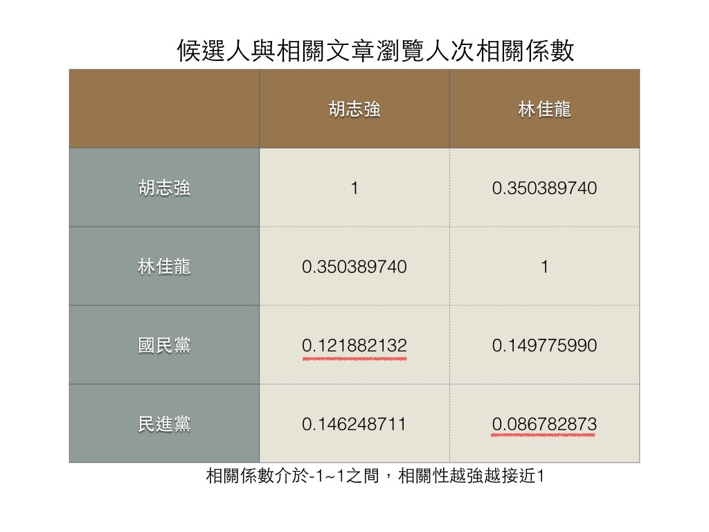 統計候選人與相關文章瀏覽的關係程度可以發現,兩組候選人與所屬政黨的關聯度很低,由其實林佳龍與其相關文章的瀏覽,雖至目前為止,討論主軸以政治相關的硬新聞為主,相關係數仍低於胡志強。