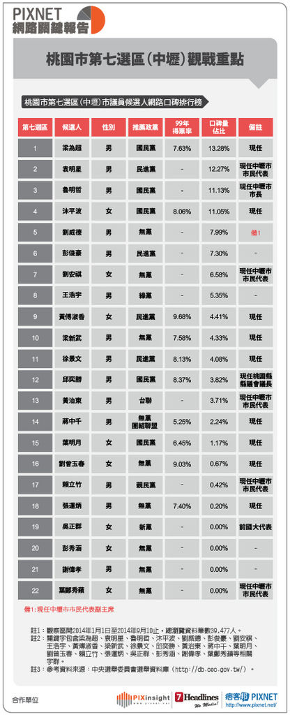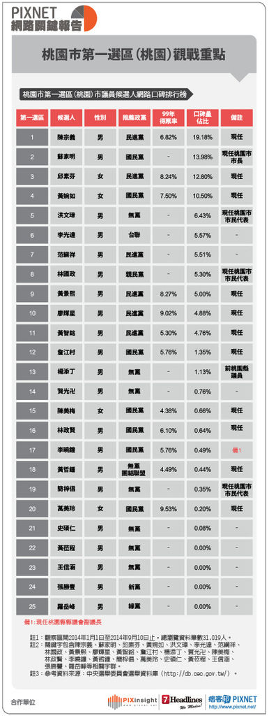 桃園市升格後各選區議員競爭相當激烈,有前鄉長、議員再次捲土重來、鄉鎮市民代表轉戰市議員、黨內初選失利獨立脫黨參選或披它黨戰袍出征…等,而在選舉名單大爆炸的狀態下,獨立參選的候選人是否會危及原來的同黨同志,或是造成鷸蚌相爭,漁翁得利?還是脫黨的與正式提名的候選人都能雙雙上壘?現任議員中有多少議員能完成連任?中國國民黨是否還能維持過半?哪些現任議員,出現了可能吊車尾/或高票當選的邊緣?我們將透過PIXINSIGHT網路的口碑一探就竟!